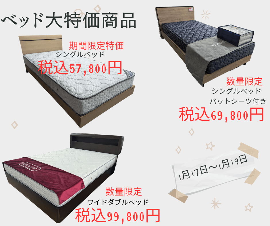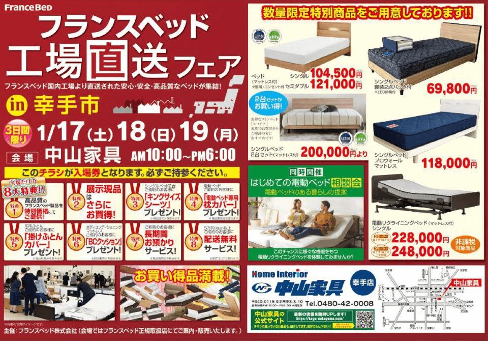 お正月企画 第二弾 大特価ベッド祭 2026年1月17日~1月19日 2026 1/12 最新イベント/キャンペーン情報 January 8, 2026January 12, 2026 フランスベッド工場直送フェア ベッド下のデッドスペースをフル活用 令和の新しい収納スタイル 憧れのシモンズベッド特別ご優待セール 非課税価格 電動ベッド大特価祭 1月17日~1月19日 大人気ベッドメーカー商品も期間限定特別ご優待価格にてご案内 アウトレット・クリアランスセール同時開催 不要家具お引き取り 椅子修理 最新イベント/キャンペーン情報 気に入ったらシェア URLをコピーしました! 2026初売り 家具インテリア お年玉セール 1月2日~1月12日 大特価ベッドセール 家具アウトレット祭←同時開催 2月21日~3月1日 関連記事 大特価ベッドセール 家具アウトレット祭←同時開催 2月21日~3月1日 February 10, 2026 2026初売り 家具インテリア お年玉セール 1月2日~1月12日 December 29, 2025 2025年歳末インテリア家具イベントin埼玉 12月29日(月)まで November 22, 2025 ローバックチェアキャンペーンin中山家具 11月22日(土)~12月14日(日) November 10, 2025 カリモク家具 ザ・ファーストサンクスフェアin中山家具 11月1日~30日 October 31, 2025 秋のリクライニングチェアキャンペーンin中山家具 9月6日~11月3日 September 4, 2025 ナガノインテリア 夏のソファキャンペーンin中山家具 8月9日~9月7日 August 5, 2025 パラマウントベッド プレゼントキャンペーンin中山家具 8月2日~9月23日 August 1, 2025